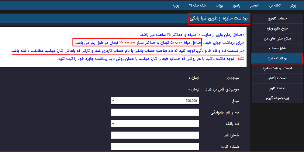 پس از اینکه در سایت SamanBet فعالیت کردید و از بازی های مختلف سود به دست آوردید، می توانید به راحتی موجودی خود را برداشت کنید. برای این کار کافی است وارد حساب کاربری خود شوید و از منوی سمت راست گزینه برداشت جایزه را انتخاب نمایید.
