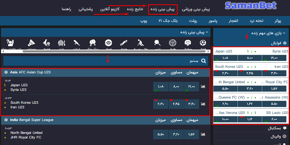 سایت شرط بندی سامان بت (SamanBet) یکی از کامل ترین و به روز ترین بخش های پیش بینی ورزشی را در بین سایت های ایرانی دارد. کاربران می توانند در این بخش بر روی مسابقات متنوع ورزشی چه قبل از شروع و چه در حین برگزاری مسابقه شرط بندی کنند.