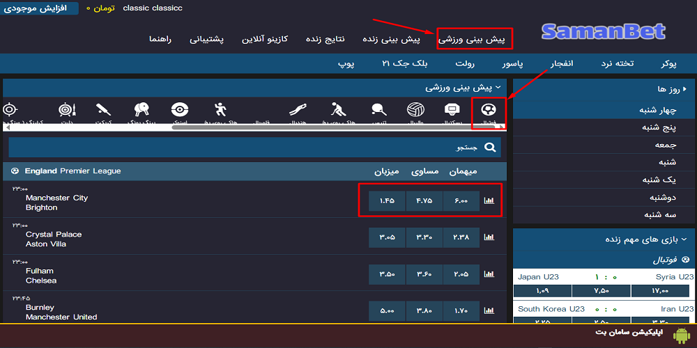ضرایب پیش بینی فوتبال در سامان بت